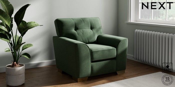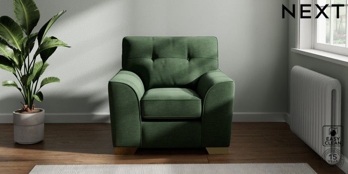 7.2.10 Stamford Buttoned Back Armchair Fine Chenille Easy Clean Mid Khaki Green Square Angle - Brushed Brass | Made Click here to use our website with more accessibility support, for example screen readers