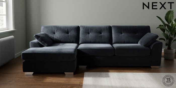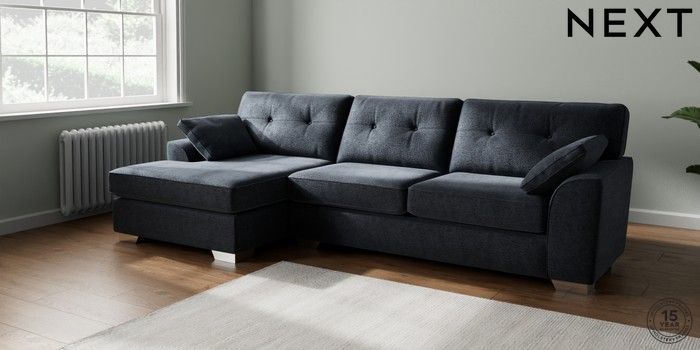 7.2.10 Stamford Buttoned Back Large Sofa Chaise - Left Hand Boucle Chenille Dark Slate Blue Large Square Angle - Chrome Metal | Made Click here to use our website with more accessibility support, for example screen readers
