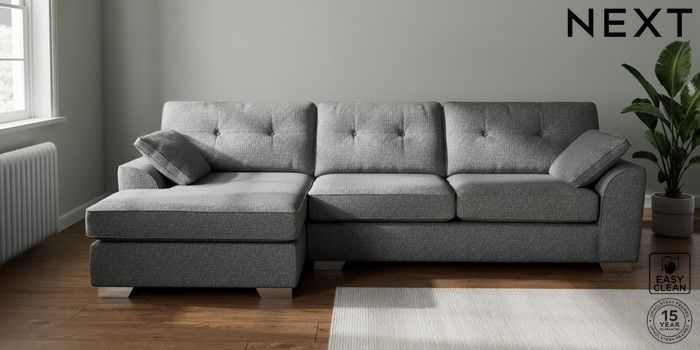 7.2.10 Stamford Buttoned Back Large Sofa Chaise - Left Hand Chunky Boucle Easy Clean Mid Grey Large Square Angle - Chrome Metal | Made Click here to use our website with more accessibility support, for example screen readers