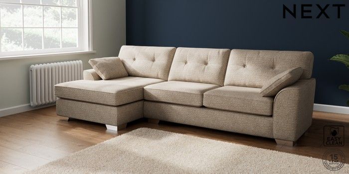 7.2.10 Stamford Buttoned Back Large Sofa Chaise - Left Hand Chunky Boucle Easy Clean Mid Natural Large Square Angle - Chrome Metal | Made Click here to use our website with more accessibility support, for example screen readers