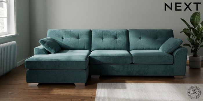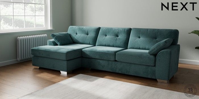 7.2.10 Stamford Buttoned Back Large Sofa Chaise - Left Hand Chunky Chenille Mid Teal Green Large Square Angle - Chrome Metal | Made Click here to use our website with more accessibility support, for example screen readers