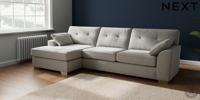 7.2.10 Stamford Buttoned Back Large Sofa Chaise - Left Hand Chunky Texture Dove Large Square Angle - Brushed Brass | Made Click here to use our website with more accessibility support, for example screen readers