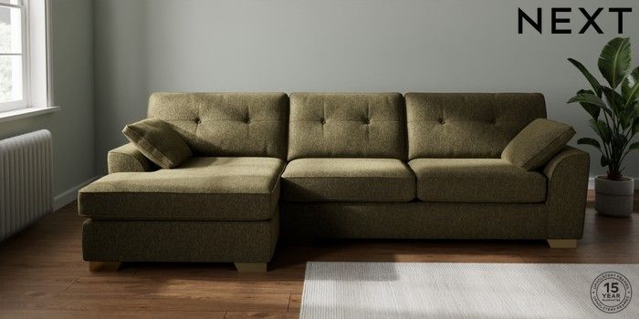 7.2.10 Stamford Buttoned Back Large Sofa Chaise - Left Hand Cotswold Chenille Dark Green Large Square Angle - Brushed Brass | Made Click here to use our website with more accessibility support, for example screen readers