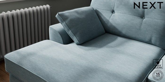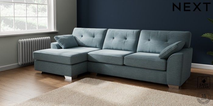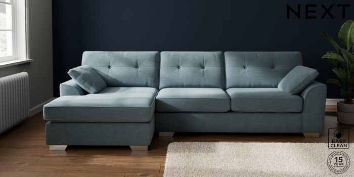 7.2.10 Stamford Buttoned Back Large Sofa Chaise - Left Hand Fine Chenille Easy Clean Mid Blue Large Square Angle - Chrome Metal | Made Click here to use our website with more accessibility support, for example screen readers