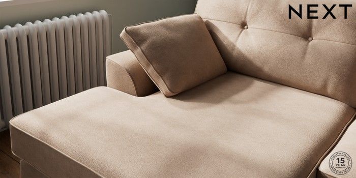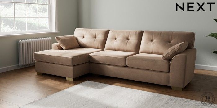 7.2.10 Stamford Buttoned Back Large Sofa Chaise - Left Hand Luxe Chenille Mid Natural Large Square Angle - Brushed Brass | Made Click here to use our website with more accessibility support, for example screen readers