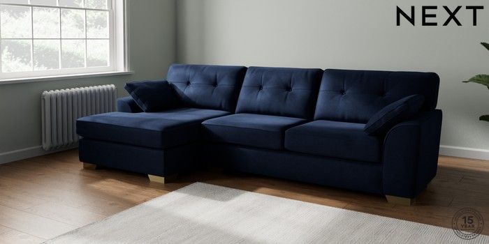 7.2.10 Stamford Buttoned Back Large Sofa Chaise - Left Hand Luxe Chenille Navy Blue Large Square Angle - Brushed Brass | Made Click here to use our website with more accessibility support, for example screen readers