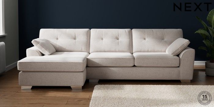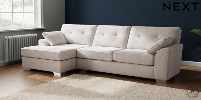 7.2.10 Stamford Buttoned Back Large Sofa Chaise - Left Hand Multi Weave Oyster Large Square Angle - Chrome Metal | Made Click here to use our website with more accessibility support, for example screen readers