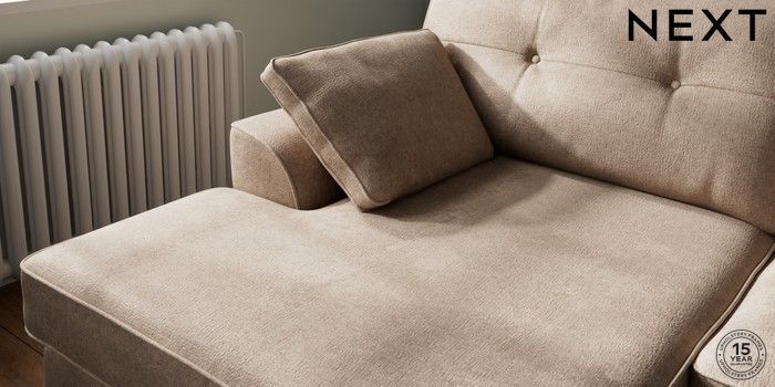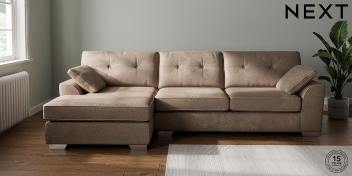 7.2.10 Stamford Buttoned Back Large Sofa Chaise - Left Hand Plush Chenille Mid Natural Large Square Angle - Chrome Metal | Made Click here to use our website with more accessibility support, for example screen readers