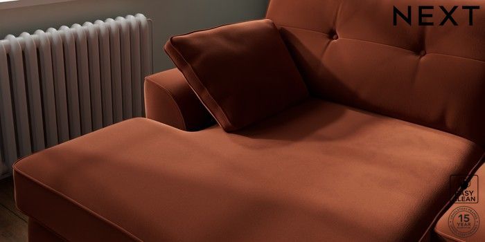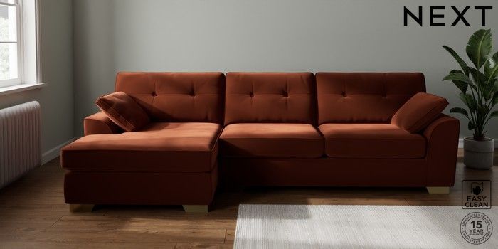 7.2.10 Stamford Buttoned Back Large Sofa Chaise - Left Hand Plush Velvet Easy Clean Ginger Orange Large Square Angle - Brushed Brass | Made Click here to use our website with more accessibility support, for example screen readers