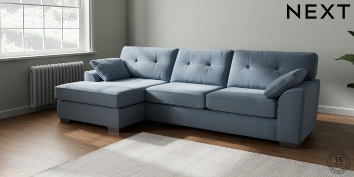 7.2.10 Stamford Buttoned Back Large Sofa Chaise - Left Hand Relaxed Linen Look Mid Blue Large Square Angle - Gunmetal | Made Click here to use our website with more accessibility support, for example screen readers