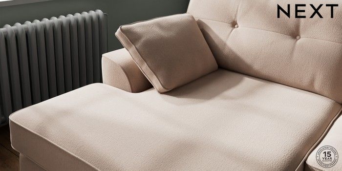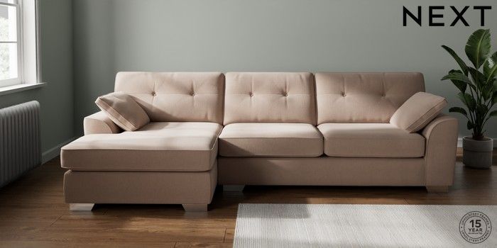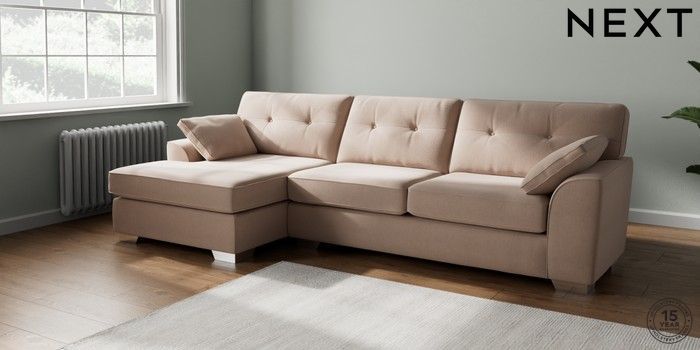 7.2.10 Stamford Buttoned Back Large Sofa Chaise - Left Hand Relaxed Linen Look Mid Natural Large Square Angle - Chrome Metal | Made Click here to use our website with more accessibility support, for example screen readers