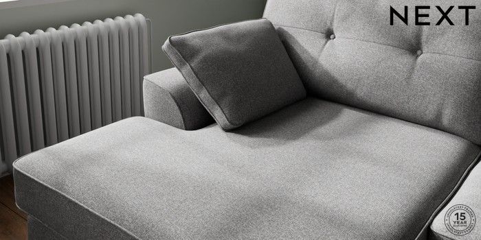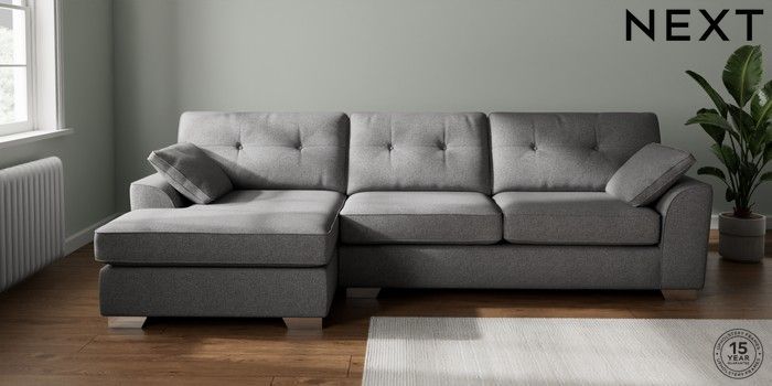 7.2.10 Stamford Buttoned Back Large Sofa Chaise - Left Hand Studio Chenille Mid Grey Large Square Angle - Chrome Metal | Made Click here to use our website with more accessibility support, for example screen readers