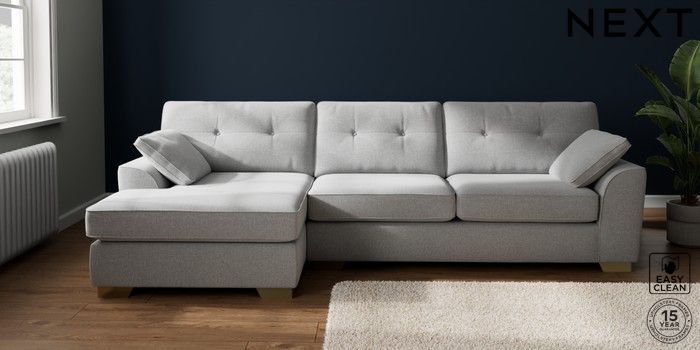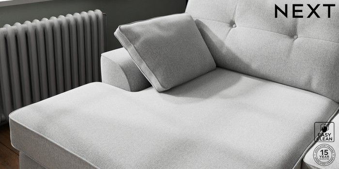 7.2.10 Stamford Buttoned Back Large Sofa Chaise - Left Hand Tweedy Blend Easy Clean Light Silver Grey Large Square Angle - Brushed Brass | Made Click here to use our website with more accessibility support, for example screen readers