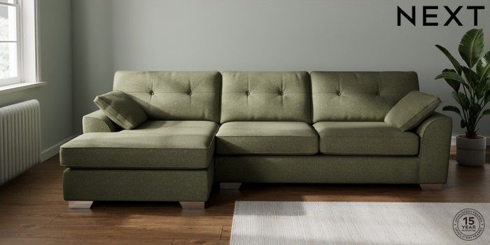 7.2.10 Stamford Buttoned Back Large Sofa Chaise - Left Hand Tweedy Chenille Mid Moss Green Large Square Angle - Chrome Metal | Made Click here to use our website with more accessibility support, for example screen readers