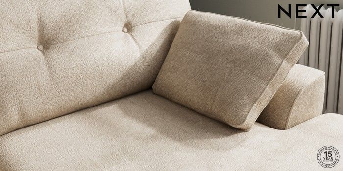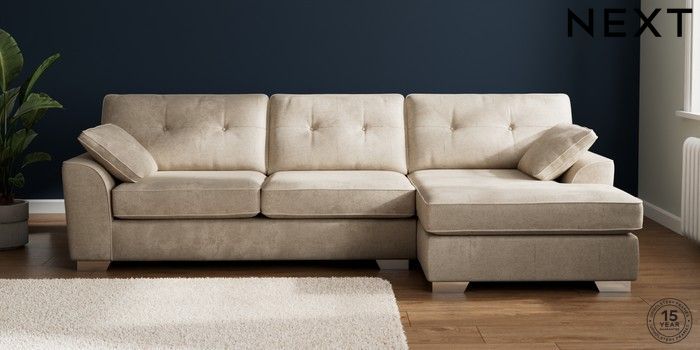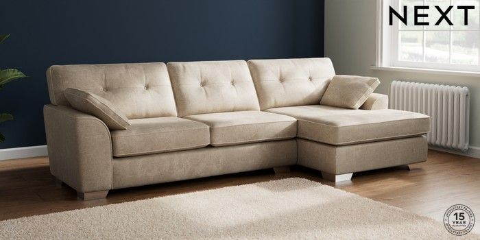 7.2.10 Stamford Buttoned Back Large Sofa Chaise - Right Hand Plush Chenille Light Natural Large Square Angle - Chrome Metal | Made Click here to use our website with more accessibility support, for example screen readers
