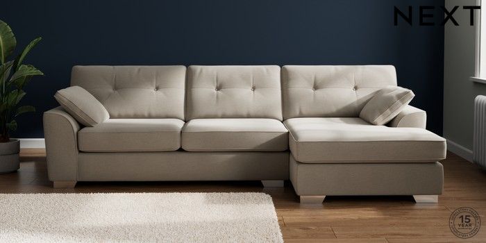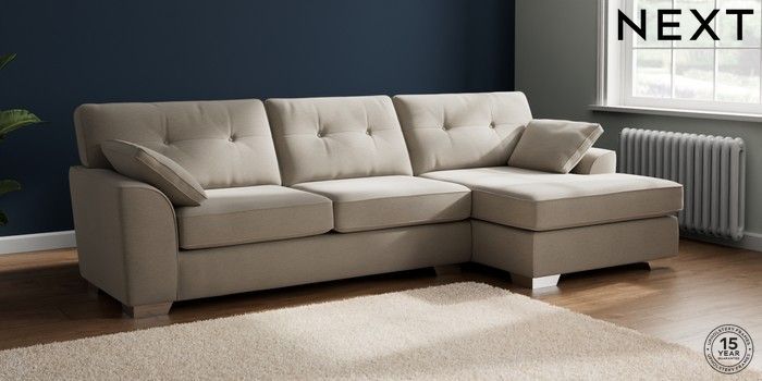 7.2.10 Stamford Buttoned Back Large Sofa Chaise - Right Hand Ripple Chenille Light Natural Large Square Angle - Chrome Metal | Made Click here to use our website with more accessibility support, for example screen readers