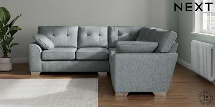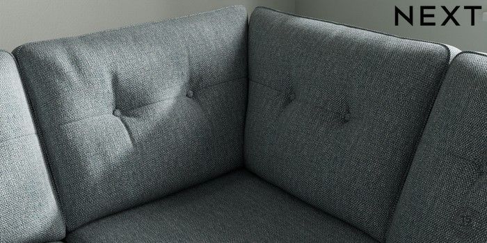 7.2.10 Stamford Buttoned Back Medium Corner Sofa - Universal Chunky Weave Mid Blue Large Square Angle - Chrome Metal | Made Click here to use our website with more accessibility support, for example screen readers