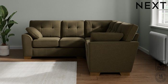 7.2.10 Stamford Buttoned Back Medium Corner Sofa - Universal Fine Chenille Easy Clean Dark Moss Green Large Square Angle - Brushed Brass | Made Click here to use our website with more accessibility support, for example screen readers