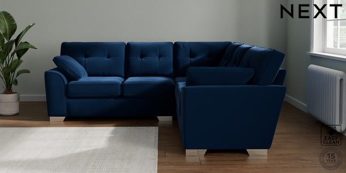 7.2.10 Stamford Buttoned Back Medium Corner Sofa - Universal Plush Velvet Easy Clean Navy Blue Large Square Angle - Chrome Metal | Made Click here to use our website with more accessibility support, for example screen readers