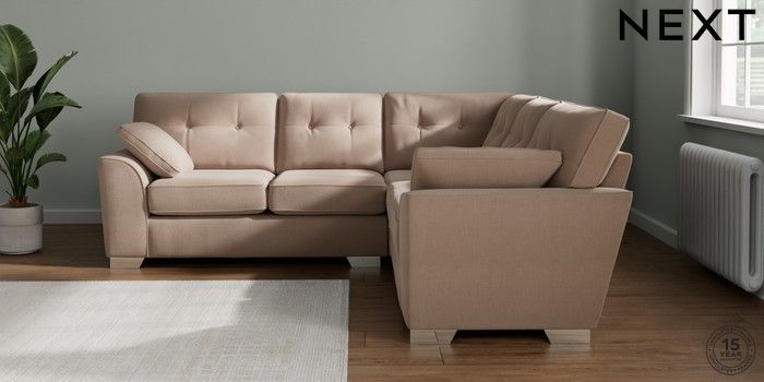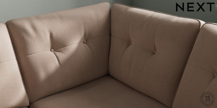7.2.10 Stamford Buttoned Back Medium Corner Sofa - Universal Relaxed Linen Look Mid Natural Large Square Angle - Chrome Metal | Made Click here to use our website with more accessibility support, for example screen readers