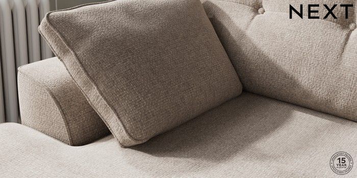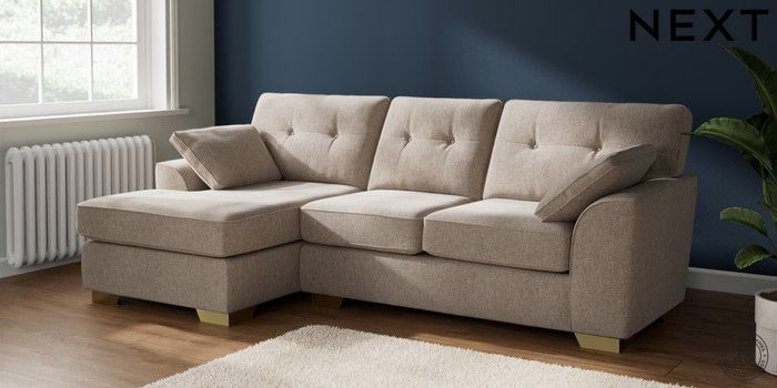 7.2.10 Stamford Buttoned Back Medium Sofa Chaise - Left Hand Chunky Chenille Light Dove Large Square Angle - Brushed Brass | Made Click here to use our website with more accessibility support, for example screen readers