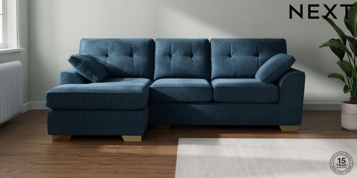 7.2.10 Stamford Buttoned Back Medium Sofa Chaise - Left Hand Cotswold Chenille Dark Blue Large Square Angle - Brushed Brass | Made Click here to use our website with more accessibility support, for example screen readers