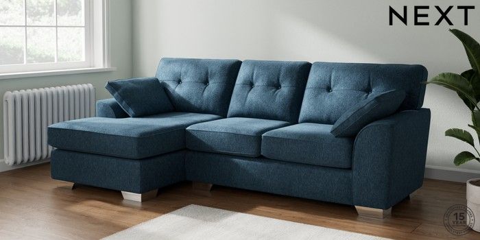 7.2.10 Stamford Buttoned Back Medium Sofa Chaise - Left Hand Cotswold Chenille Dark Blue Large Square Angle - Chrome Metal | Made Click here to use our website with more accessibility support, for example screen readers