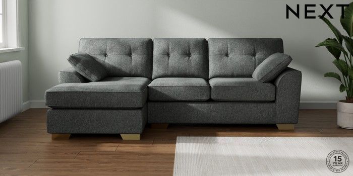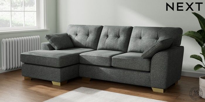 7.2.10 Stamford Buttoned Back Medium Sofa Chaise - Left Hand Cotswold Chenille Dark Grey Large Square Angle - Brushed Brass | Made Click here to use our website with more accessibility support, for example screen readers