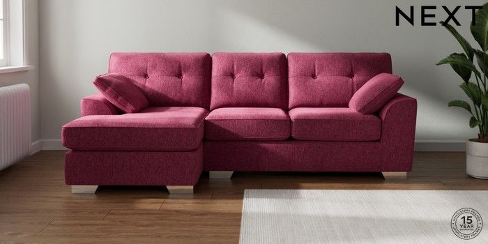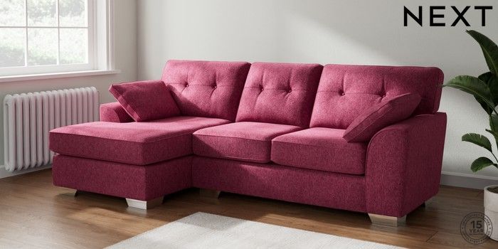 7.2.10 Stamford Buttoned Back Medium Sofa Chaise - Left Hand Cotswold Chenille Dark Raspberry Pink Large Square Angle - Chrome Metal | Made Click here to use our website with more accessibility support, for example screen readers