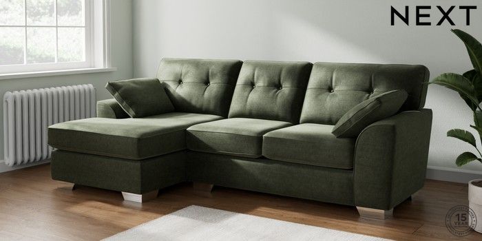 7.2.10 Stamford Buttoned Back Medium Sofa Chaise - Left Hand Luxe Chenille Mid Green Large Square Angle - Chrome Metal | Made Click here to use our website with more accessibility support, for example screen readers