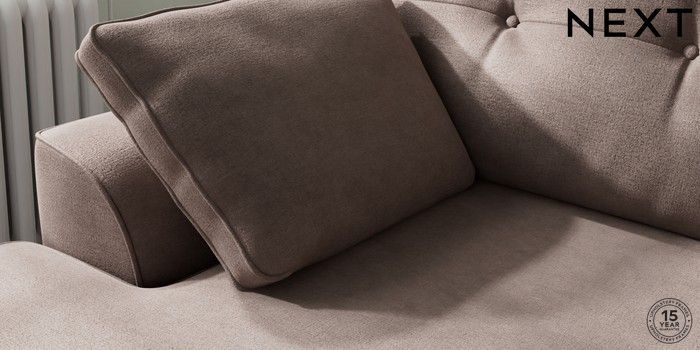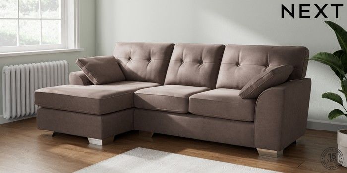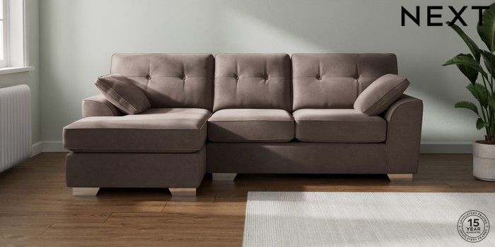 7.2.10 Stamford Buttoned Back Medium Sofa Chaise - Left Hand Luxe Chenille Mink Brown Large Square Angle - Chrome Metal | Made Click here to use our website with more accessibility support, for example screen readers