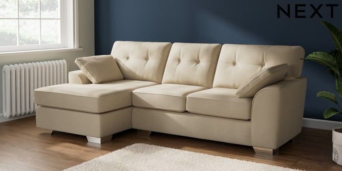 7.2.10 Stamford Buttoned Back Medium Sofa Chaise - Left Hand Natural Mix Light Natural Large Square Angle - Chrome Metal | Made Click here to use our website with more accessibility support, for example screen readers