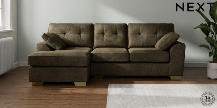 7.2.10 Stamford Buttoned Back Medium Sofa Chaise - Left Hand Plush Chenille Moss Green Large Square Angle - Brushed Brass | Made Click here to use our website with more accessibility support, for example screen readers