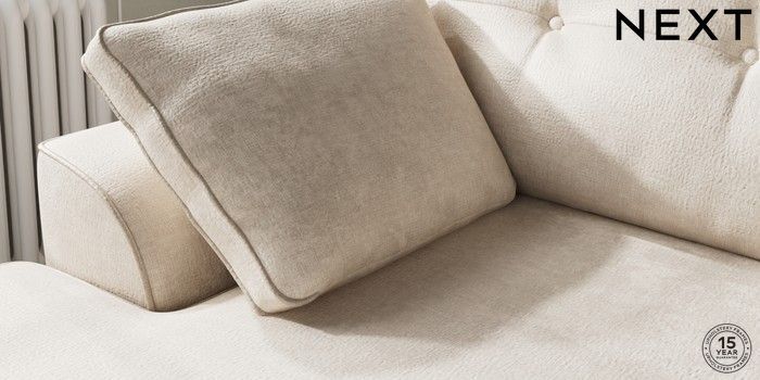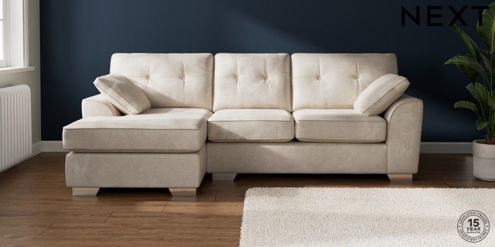 7.2.10 Stamford Buttoned Back Medium Sofa Chaise - Left Hand Plush Chenille Oyster Large Square Angle - Chrome Metal | Made Click here to use our website with more accessibility support, for example screen readers