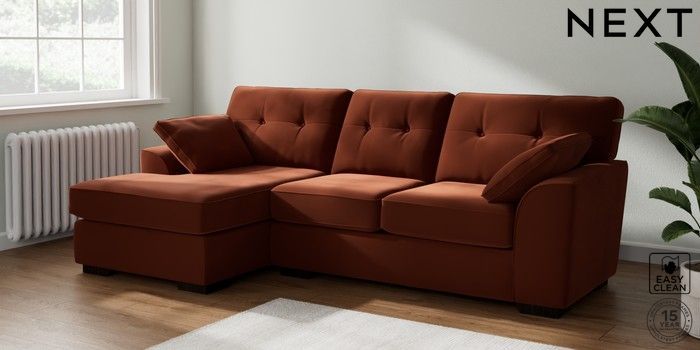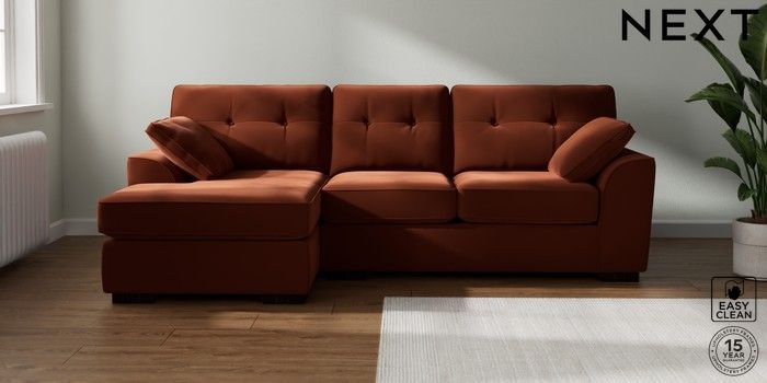 7.2.10 Stamford Buttoned Back Medium Sofa Chaise - Left Hand Plush Velvet Easy Clean Ginger Orange Large Square Angle - Dark | Made Click here to use our website with more accessibility support, for example screen readers