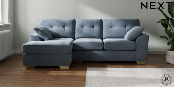 7.2.10 Stamford Buttoned Back Medium Sofa Chaise - Left Hand Relaxed Linen Look Mid Blue Large Square Angle - Brushed Brass | Made Click here to use our website with more accessibility support, for example screen readers