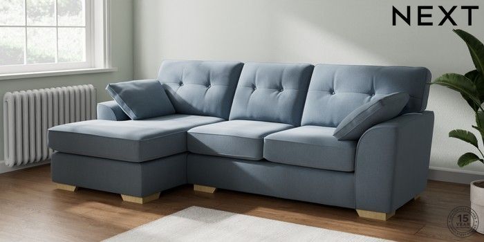 7.2.10 Stamford Buttoned Back Medium Sofa Chaise - Left Hand Relaxed Linen Look Mid Blue Large Square Angle - Light | Made Click here to use our website with more accessibility support, for example screen readers