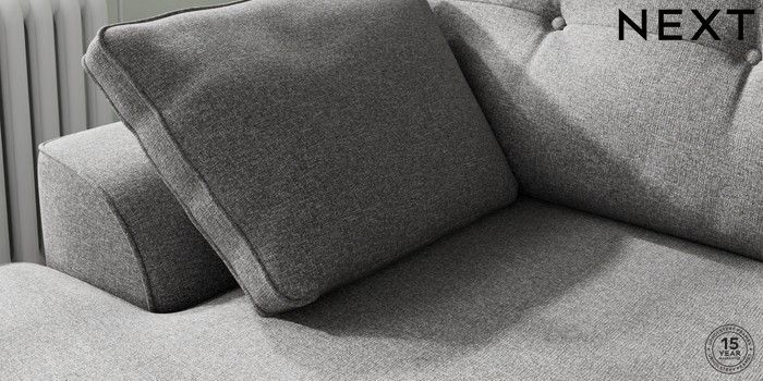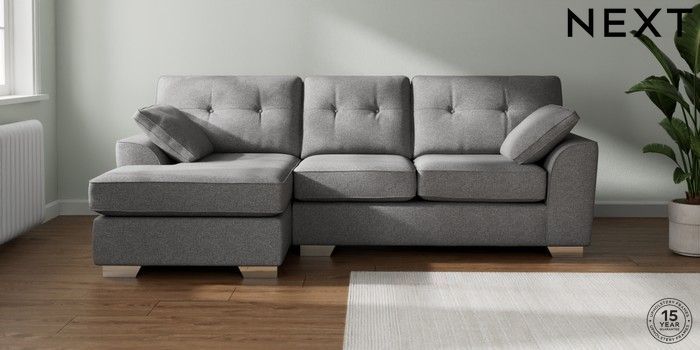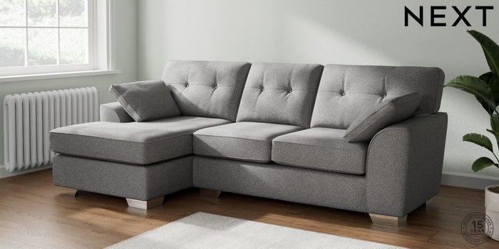 7.2.10 Stamford Buttoned Back Medium Sofa Chaise - Left Hand Studio Chenille Mid Grey Large Square Angle - Chrome Metal | Made Click here to use our website with more accessibility support, for example screen readers