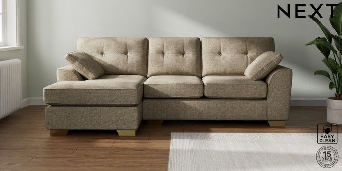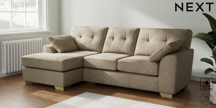 7.2.10 Stamford Buttoned Back Medium Sofa Chaise - Left Hand Woven Chenille Easy Clean Mid Natural Large Square Angle - Brushed Brass | Made Click here to use our website with more accessibility support, for example screen readers