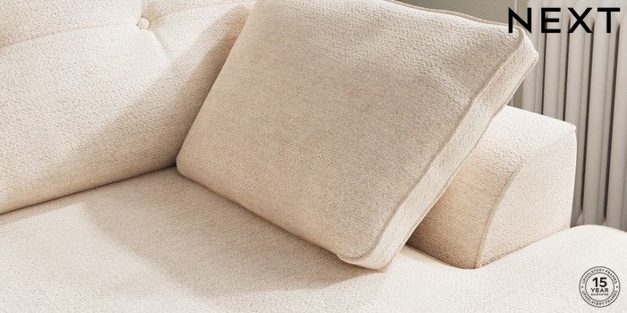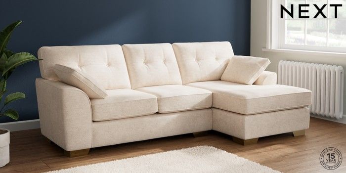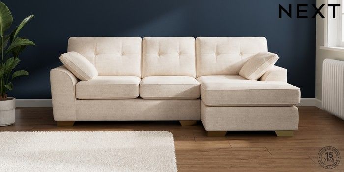 7.2.10 Stamford Buttoned Back Medium Sofa Chaise - Right Hand Boucle Chenille Oyster Large Square Angle - Brushed Brass | Made Click here to use our website with more accessibility support, for example screen readers