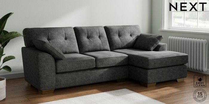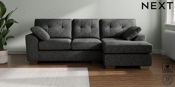 7.2.10 Stamford Buttoned Back Medium Sofa Chaise - Right Hand Boucle Weave Easy Clean Charcoal Grey Large Square Angle - Brushed Brass | Made Click here to use our website with more accessibility support, for example screen readers