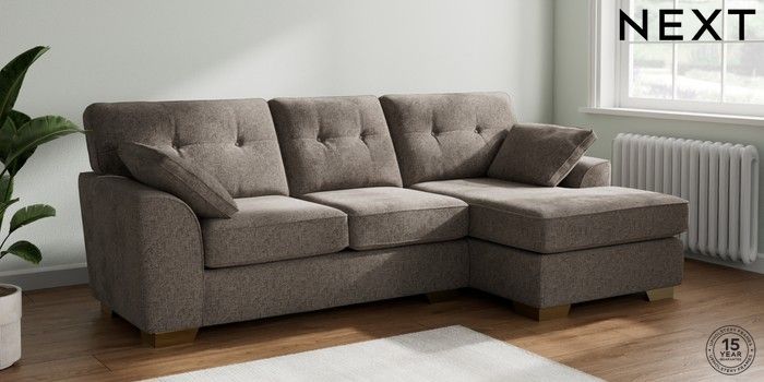 7.2.10 Stamford Buttoned Back Medium Sofa Chaise - Right Hand Chunky Chenille Mink Brown Large Square Angle - Brushed Brass | Made Click here to use our website with more accessibility support, for example screen readers
