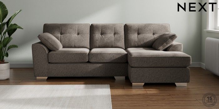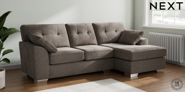 7.2.10 Stamford Buttoned Back Medium Sofa Chaise - Right Hand Chunky Chenille Mink Brown Large Square Angle - Chrome Metal | Made Click here to use our website with more accessibility support, for example screen readers