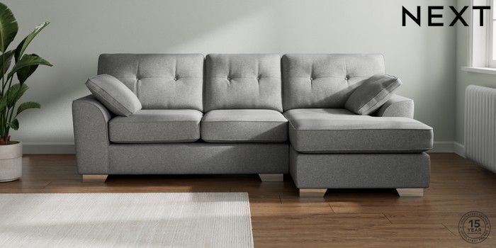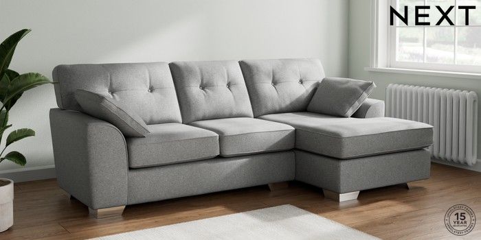 7.2.10 Stamford Buttoned Back Medium Sofa Chaise - Right Hand Chunky Weave Mid Grey Large Square Angle - Chrome Metal | Made Click here to use our website with more accessibility support, for example screen readers