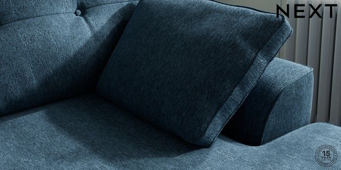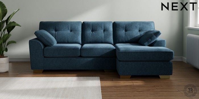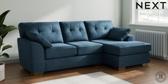 7.2.10 Stamford Buttoned Back Medium Sofa Chaise - Right Hand Cotswold Chenille Dark Blue Large Square Angle - Brushed Brass | Made Click here to use our website with more accessibility support, for example screen readers