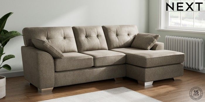 7.2.10 Stamford Buttoned Back Medium Sofa Chaise - Right Hand Cotswold Chenille Mid Mink Brown Large Square Angle - Chrome Metal | Made Click here to use our website with more accessibility support, for example screen readers