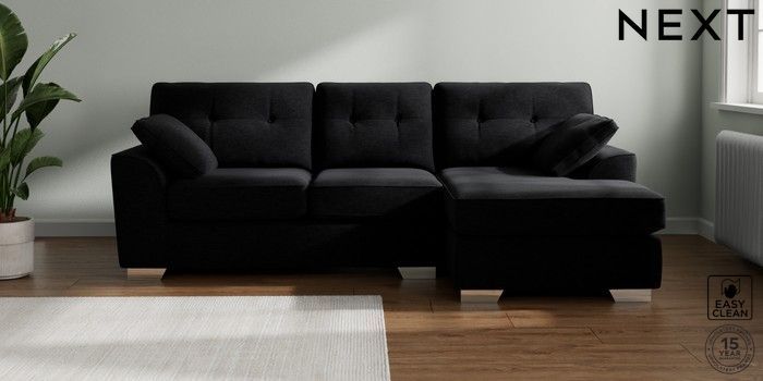 7.2.10 Stamford Buttoned Back Medium Sofa Chaise - Right Hand Fine Chenille Easy Clean Black Large Square Angle - Chrome Metal | Made Click here to use our website with more accessibility support, for example screen readers