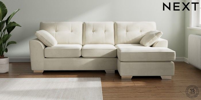 7.2.10 Stamford Buttoned Back Medium Sofa Chaise - Right Hand Luxe Chenille Oyster Large Square Angle - Chrome Metal | Made Click here to use our website with more accessibility support, for example screen readers