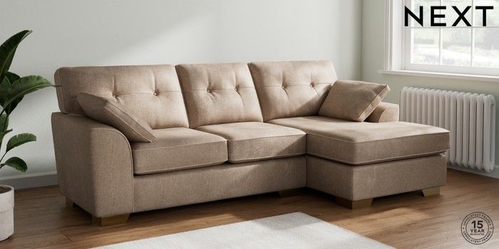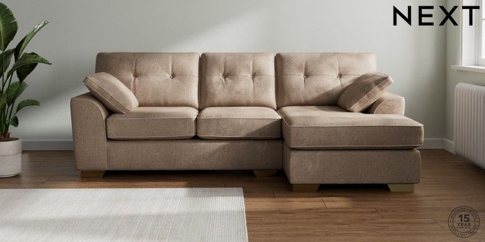 7.2.10 Stamford Buttoned Back Medium Sofa Chaise - Right Hand Plush Chenille Mid Natural Large Square Angle - Brushed Brass | Made Click here to use our website with more accessibility support, for example screen readers