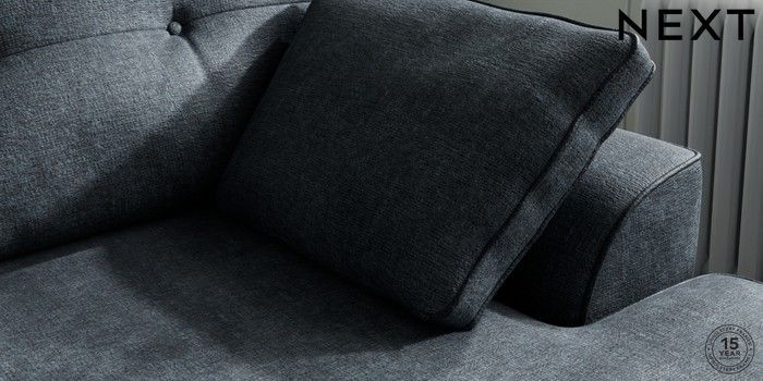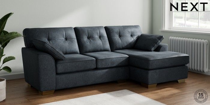 7.2.10 Stamford Buttoned Back Medium Sofa Chaise - Right Hand Plush Chenille Slate Blue Large Square Angle - Brushed Brass | Made Click here to use our website with more accessibility support, for example screen readers